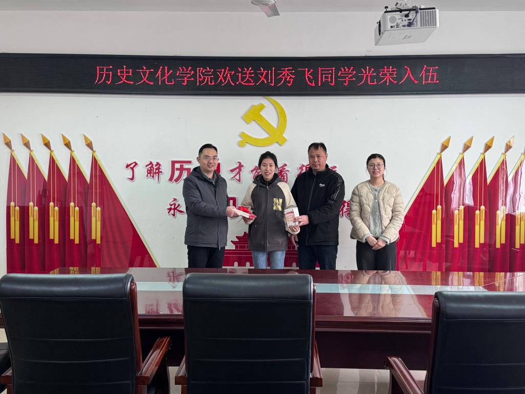 会上,领导老师对刘秀飞同学积极响应国家号召,携笔从戎的行为予以高度赞扬,并送上《平易近人——习近平的语言力量之军事卷》《毛泽东与十大元帅》等书籍和纪念品,希望她在新的人生征途上持续学习、磨炼意志、锻炼本领、建功军营。刘秀飞同学表示,在部队真学苦练,建功立业,以优异的成绩回报父母养育之恩,学院培养之情。