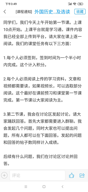 第一,建立网课授课规则,减少不确定因素。在第一节网课之前,吕老师就在学习通平台上向全体员工发邮件说明了网课规则,这些规则涉及到学校及学院的基本要求和他认为这门课应该做到的内容,比如学习成绩积分的计算、签到规则、课堂时间的分配、互动及讨论的原则等。从一开始就尽可能减少不确定因素,让同学们做到心里有数,这使得整个网课有了一个统一的形式。