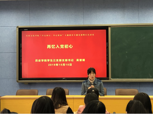 首先是党支部书记吴慧娟同志为本支部全体党员作了题为“再忆入党初心”的专题党课。