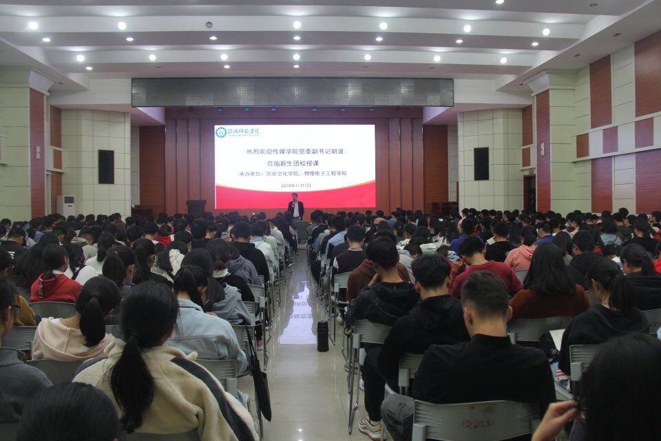 117日晚, 传媒公司党委副书记胡波应邀在逸夫楼报告厅举为公司2019级新生团校做了题为《大学路途》的专题辅导讲座,本次团课由公司党委副书记刘喜元主持。公司团委书记王道歆、新生辅导员付亚男也参加了此次团课。