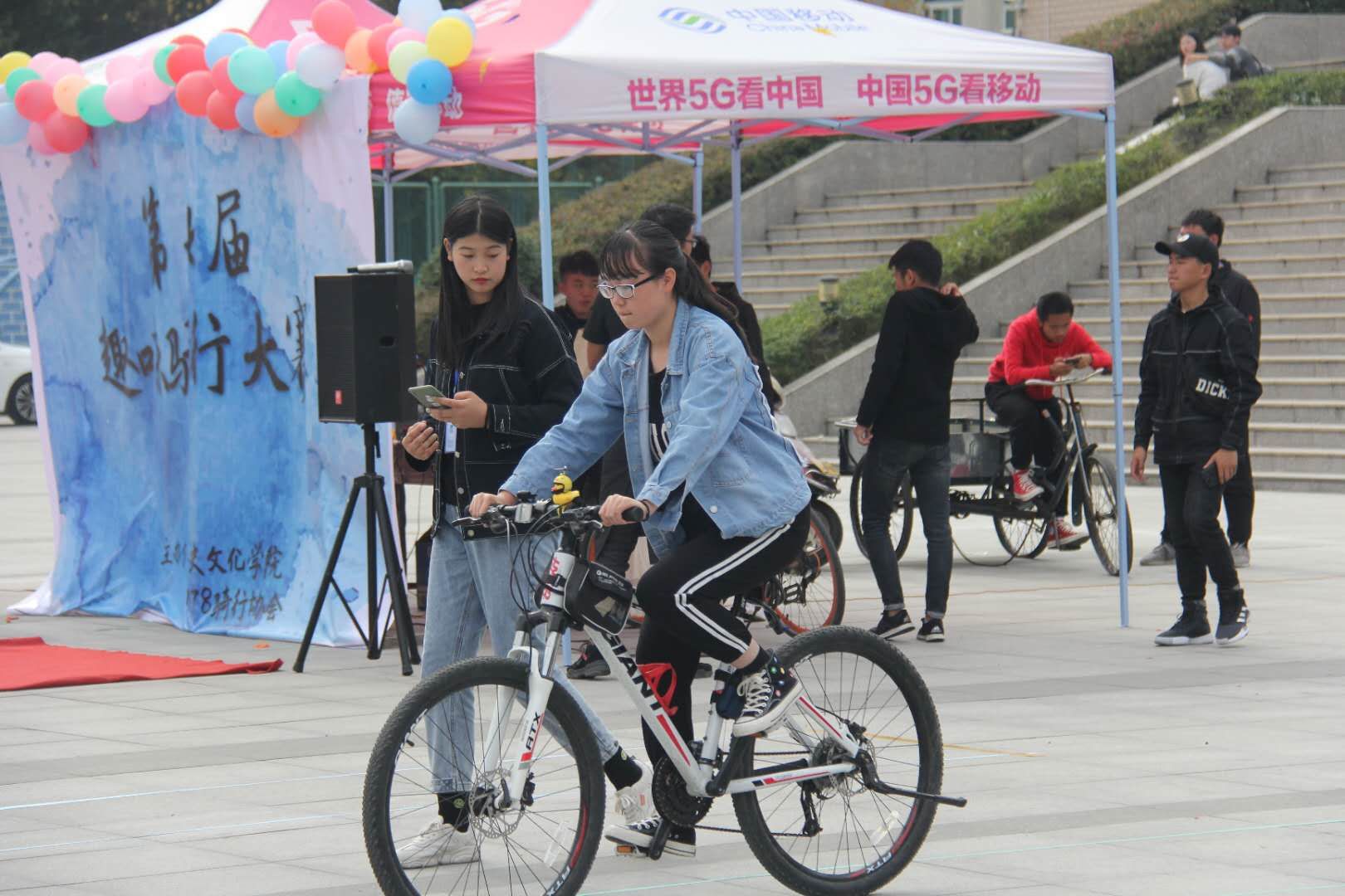 刘喜元老师致开幕词并预祝比赛圆满成功。本次自行车骑行大赛共有三项比赛内容,即慢骑赛、障碍赛和直行平衡赛。慢骑赛要求参赛选手在不使用刹车的条件下以最慢的速度完成规定赛程,时间最长者即为冠军;障碍赛为团队比赛项目,需要团队成员团结合作,清除障碍,完成比赛;直行平衡赛则是对参赛选手速度和灵活性的综合考验。比赛的各个环节中,参赛队伍都相互配合,团结协作,勇争第一。现场气氛紧张而激烈,同学们不时爆发出阵阵掌声和喝彩声。