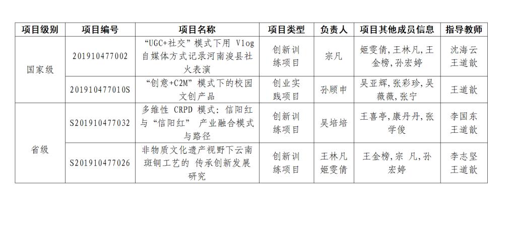 公司获批两项分别为李国东、王道歆老师指导,吴培培、王喜亭、康丹丹、张学俊为项目组成员的《多维性CRPD模式:信阳红与“信阳红”产业融合模式与路径》;由李志坚、王道歆老师指导,王林凡、姬雯倩、王金榜、宗凡、孙宏婷为项目组成员的《非物质文化遗产视野下云南斑铜工艺的传承创新发展研究》。