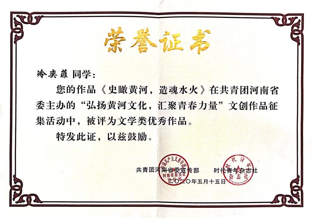 近日,由共青团河南省委主办,由共青团河南省委宣传部、时代青年杂志社、河南省青少年全媒体中心承办的“弘扬黄河文化,汇聚青春力量”文艺作品征集活动落下帷幕。公司2018级历史学1班员工冷奕菲作品《史瞰黄河,造魂水火》被评为文学类优秀作品。