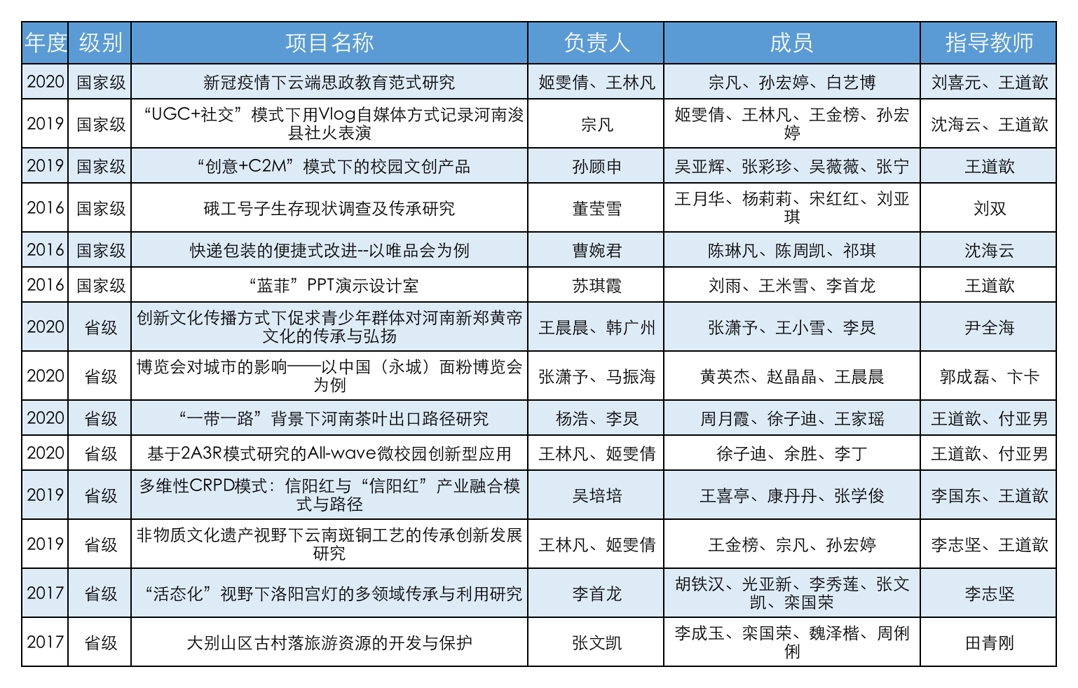 获批项目分别为由尹全海教授指导,王晨晨和韩广州主持的《创新文化传播方式下促求青少年群体对河南新郑黄帝文化的传承与弘扬》;郭成磊、卞卡老师指导,张潇予、马振海主持的《博览会对城市的影响——以中国(永城)面粉博览会为例》;王道歆、付亚男老师指导,杨浩、李炅主持的《“一带一路”背景下河南茶叶出口路径研究》;王道歆、付亚男老师指导,王林凡、姬雯倩主持的《基于2A3R模式研究的All-wave微校园创新型应用》。
