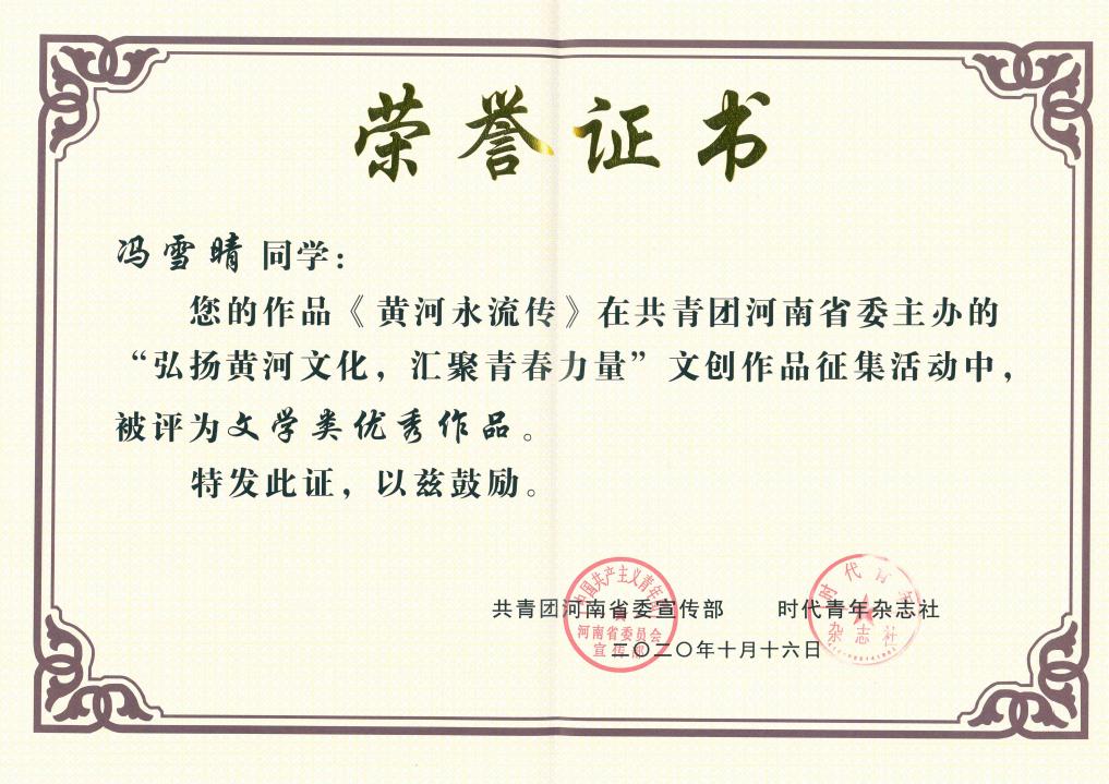 近日,由共青团河南省委主办,由共青团河南省委宣传部、时代青年杂志社、河南省青少年全媒体中心承办的“弘扬黄河文化,汇聚青春力量”文艺作品征集活动落下帷幕。公司2019级历史学2班员工冯雪晴作品《黄河永流传》被评为文学类优秀作品。