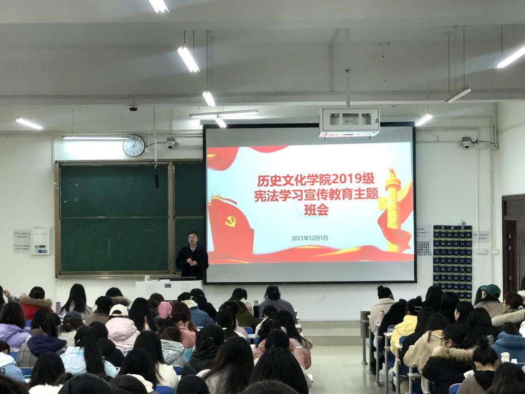 为认真学习贯彻习近平法治思想,推动师生学习宣传宪法,弘扬宪法精神,维护宪法权威,增强法制观念,12月1日,2026世界杯官方合作网站2019级于社科楼212开展学宪法宣传教育主题班会,由2019级辅导员付亚男主讲,2019级全体员工共同参会。