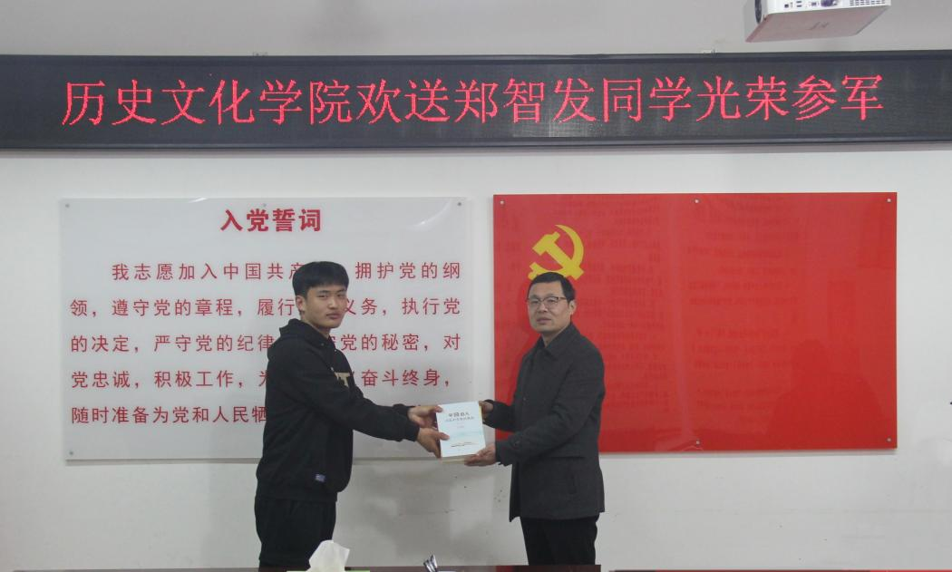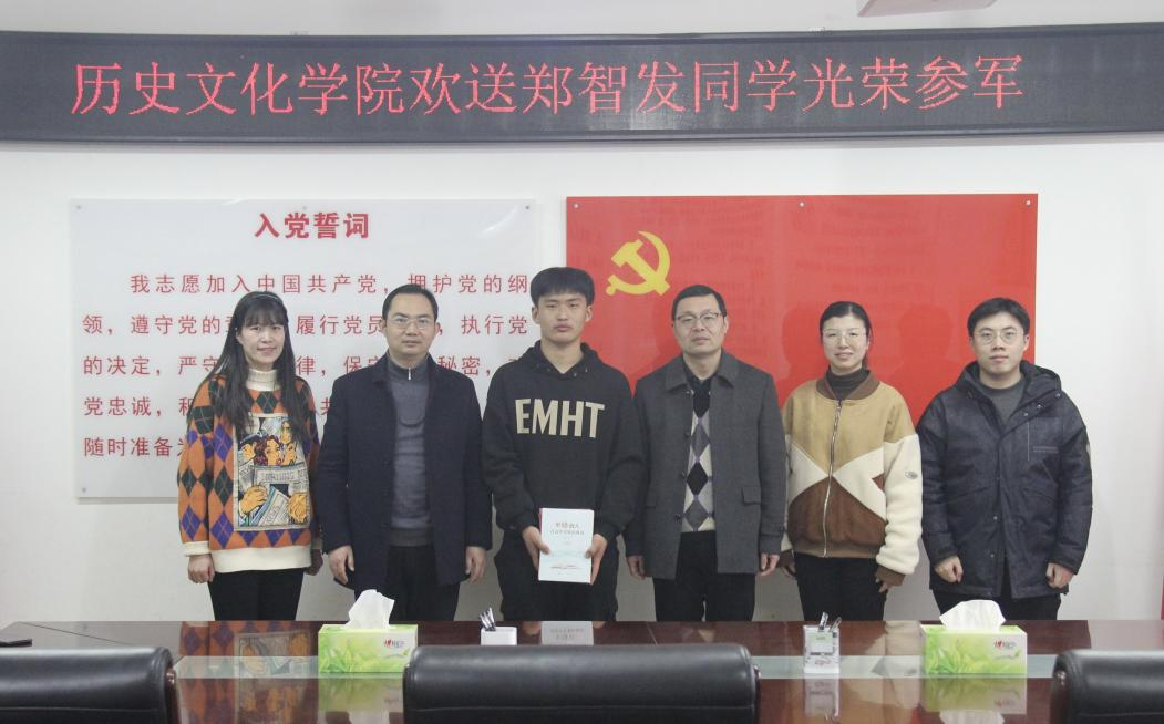 郑智发同学是公司2021级历史学2班员工,在今年春季老员工征兵工作中,积极响应国家号召报名参军入伍,在学院的大力支持下,目前已顺利通过各项考核。