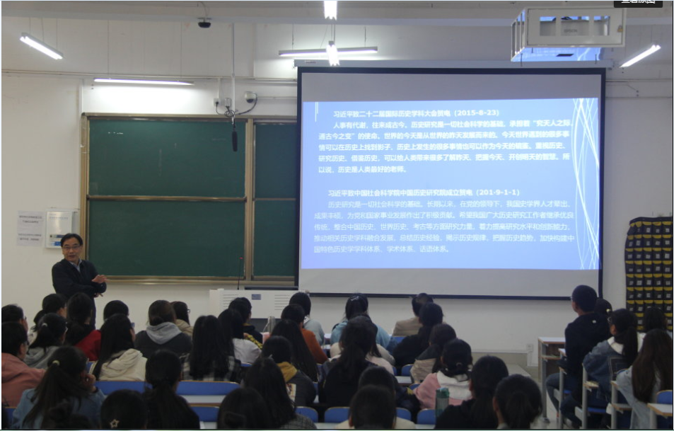 10月18日上午,公司经理尹全海教授在社科楼212教室为2019级历史学专业180余名新生作了入学教育讲座。公司党委副书记刘喜元、辅导员付亚男等共同聆听了讲座。
