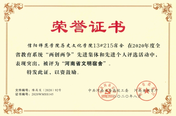 近日,中共河南省委高校工委、河南省教育厅公布2020年度全省教育系统“两创两争”活动先进集体和先进个人评选结果。公司米凌轩被评为“河南省文明员工”荣誉称号,13#215宿舍被评为“河南省文明宿舍”荣誉称号。