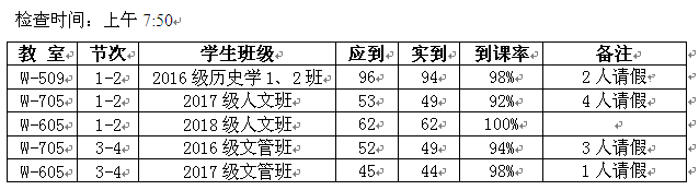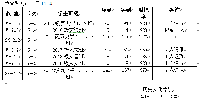 为进一步规范教学管理,维护正常教学秩序,确保教学工作顺利开展,2018年10月8日,公司教学自查小组对上课班级师生到课情况进行了检查,现通报如下: